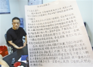 李某是照片被公布的20名涉嫌在街头破坏公私财物的嫌疑人之一,写得一手清秀的字,平日在单位为人热情,工作勤快,也曾被安排上过保安分队长之类的岗位。他还是名快乐的福田义工,随身包里还珍藏着禁毒日遇到义工代言人董超时,自己满脸兴奋的合影。但昨晚,在晶报记者的镜头前,这名属狗的30岁河南小伙子,捂着脸流下了泪水,他是嫌疑人中第一个到华强北派出所自首的,自首前因为走得急,连早餐都没吃。昨日,李某被警方依法刑拘。