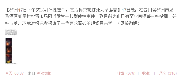 环球时报微博:【泸州17日下午突发群体性事件,官方称交警打死人系谣言】17日晚,在四川省泸州市龙马潭区红星村农贸市场附近发生一起群体性事件,到目前为止已有至少四辆警车被掀翻,并被点着。