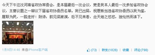 新京报讯(记者孔璞、实习生杨锋)“我已出局,祝愿新省政协委员以我为鉴,履职为民,一路走好!”因微博上反对平坟而备受舆论关注的河南省政协原常委赵克罗,9日又在微博发布了上述消息。昨晚,赵克罗在电话中向新京报记者证实,下一届河南省政协委员名单中已经没有他。