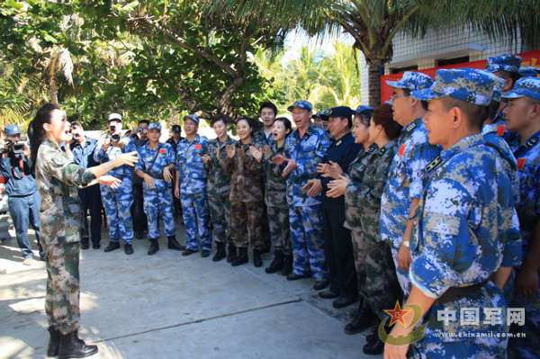 他们不顾酷热,一下舰艇就深入了解体验官兵的执勤生活。索朗旺姆、王庆爽、周晓琳、阿鲁阿卓、于芳、张英席、泽旺多吉、国雅琦等,为官兵献上了《再唱山歌给党听》《走进春天》《阳光路上》《遇上你是我的缘》《为你歌唱》《心愿》和舞蹈《花儿为什么这样红》等节目。面对纯朴的守岛官兵,演员们忘记了晕船的不适,一首接一首地为官兵歌唱,谭晶连续演唱了《妻子》《和平年代》《祖国万岁》等3首官兵喜爱的歌曲。最后演员们登上高高的信号台,专门为执勤的战士黄佳柱和温兴培清唱《在那东山顶上》。在岛上服役9年,去年获得水警区最高荣誉的“十佳天涯哨兵”黄佳柱感叹地说:“文艺战士的歌声温暖人心,鼓舞斗志,让我们终生难忘!”