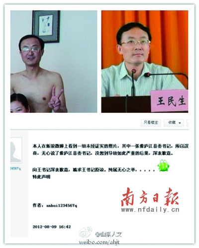 昨日下午,网友“anhui1234567q”在百度贴吧发布了一封道歉信。该网友称,“本人在新浪微博上看到一组未经证实的照片,其中一张像庐江县委书记,所以误以为真,无心说了像庐江县委书记,没想到导致如此严重的后果,深表歉意。”目前,该网友的真实身份,还无法核实。