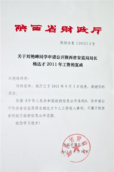 新京报讯 (记者魏铭言)昨天下午,三峡大学学生刘艳峰收到陕西省财政厅的复函。文件就其信息公开申请作出答复,称陕西省安监局局长杨达才的工资不属于财政厅政府信息公开范围。