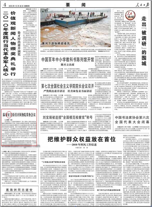 资料图:2010年12月30日出版的《人民日报》第4版的文章标题将国务院总理温家宝姓名印错