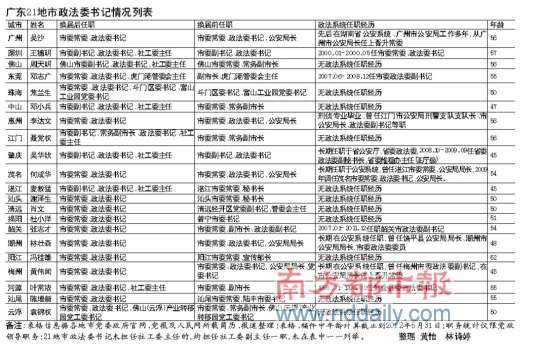 据统计,换届后,21地市中共有广州、深圳、东莞、惠州、肇庆、茂名、韶关、潮州、梅州、河源等10个地市政法委书记曾在政法系统任职。